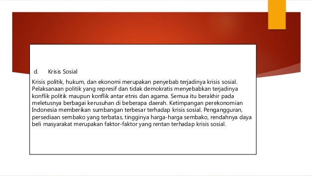 Berikut ini merupakan penyebab krisis ekonomi di Indonesia yang terjadi sejak 1997 yaitu. Dalam kamus Webster krisis didefinisikan sebagai suatu titik balik untuk menuju keadaan lebih baik atau lebih buruk. Partisipasi Politik yang menyimpang.